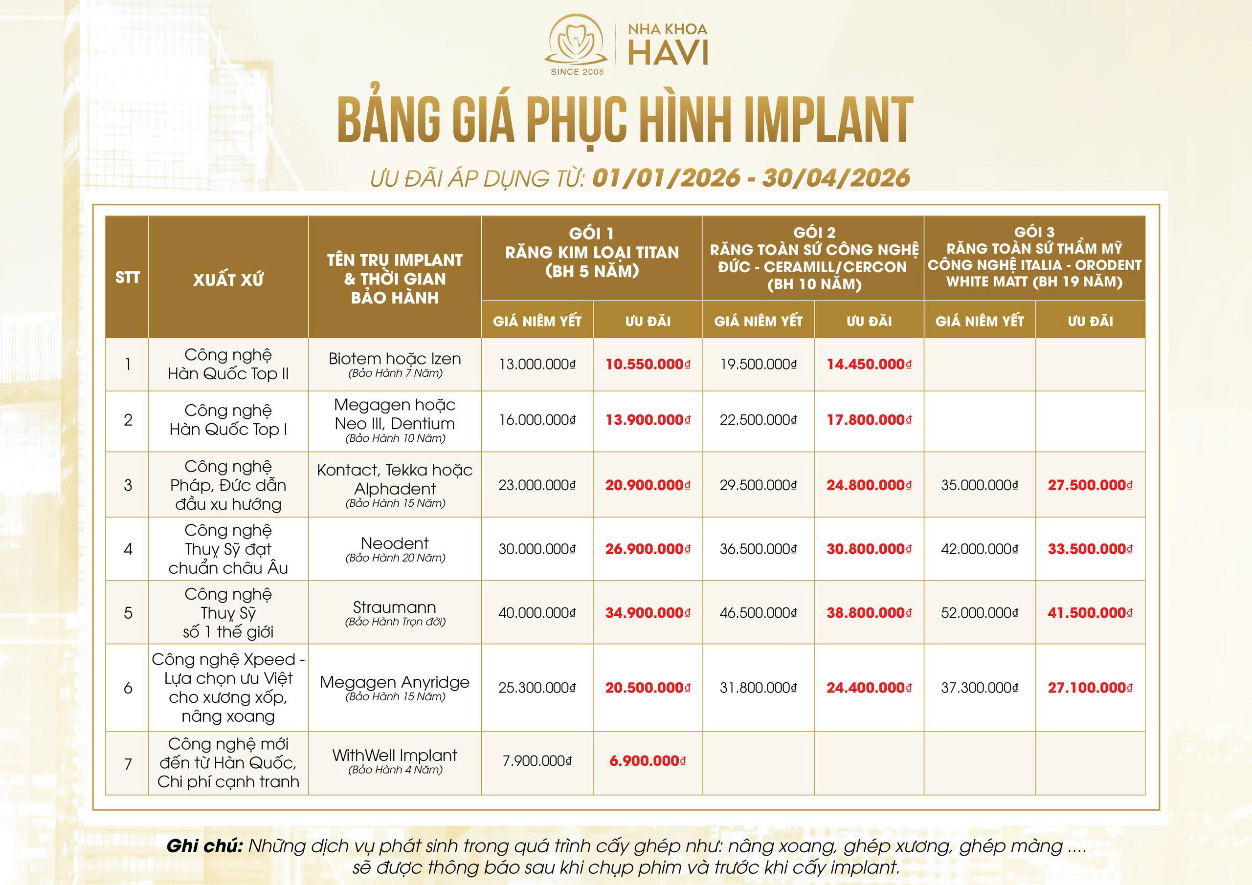 BẢNG GIÁ DỊCH VỤ TRỒNG RĂNG IMPLANT