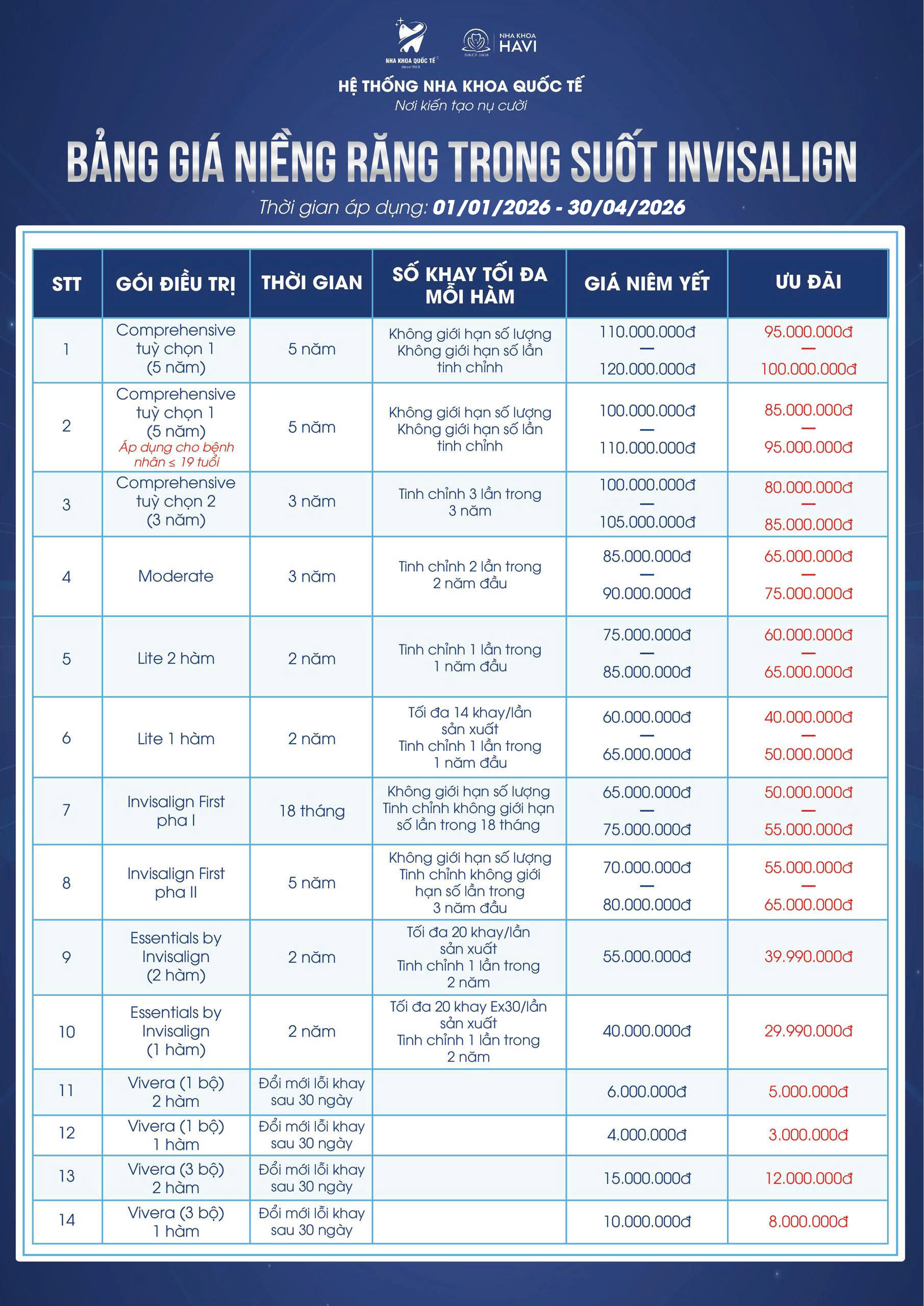 BẢNG GIÁ DỊCH VỤ NIỀNG RĂNG INVISALIGN
