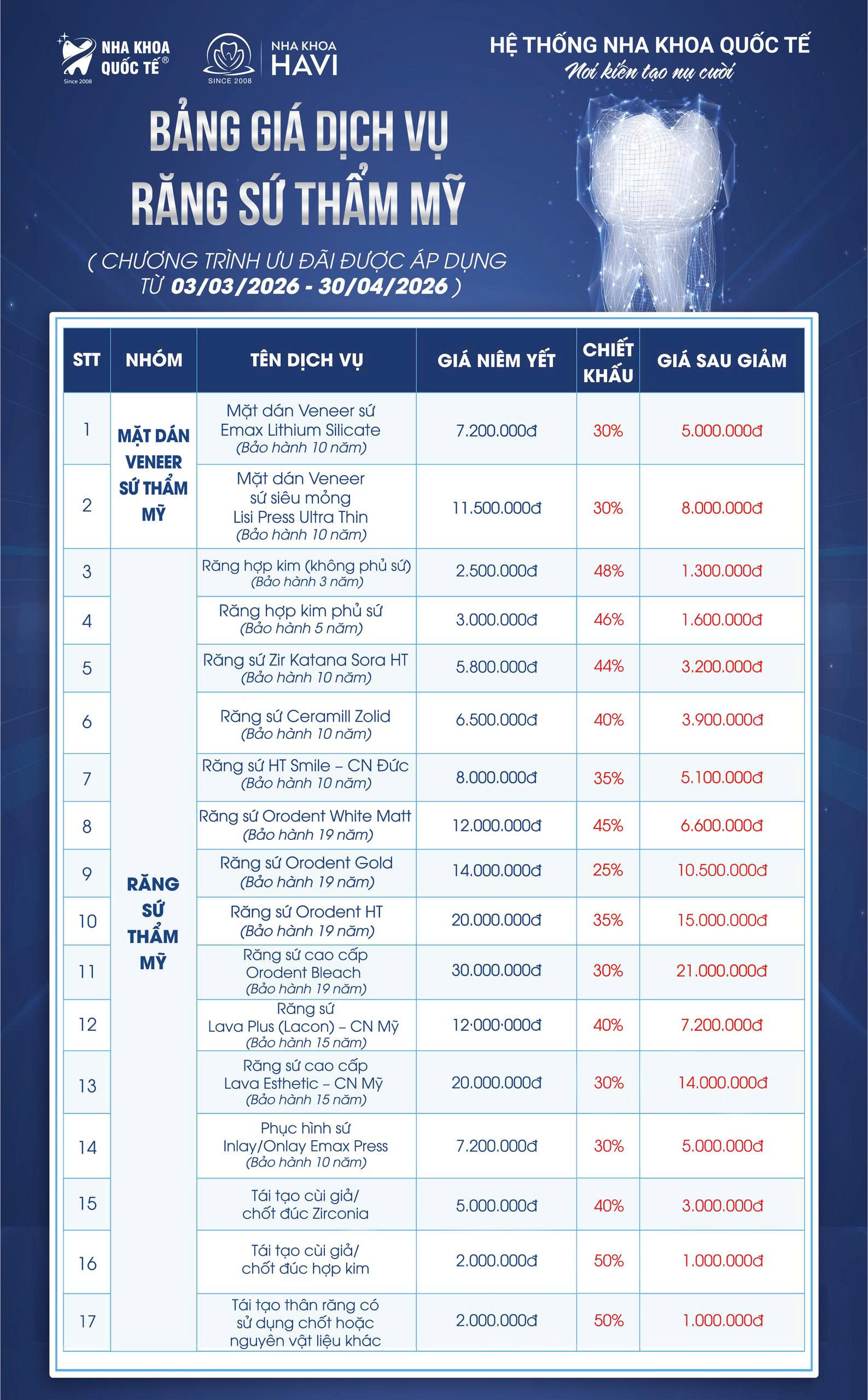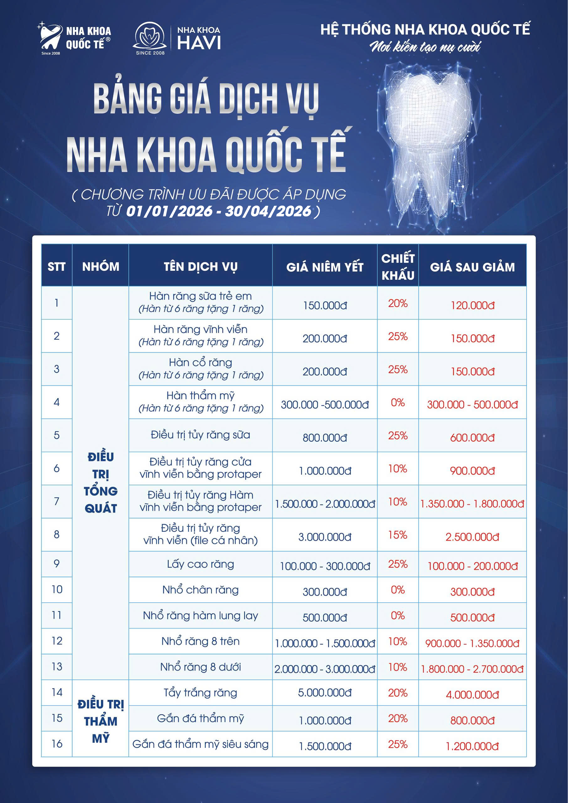 Hệ thống Nha khoa Quốc tế – Havi gửi đến Quý khách hàng bảng giá nha khoa được cập nhật mới nhất. Chúng tôi cam kết mang đến mức giá minh bạch, hợp lý cùng chất lượng dịch vụ tốt nhất.