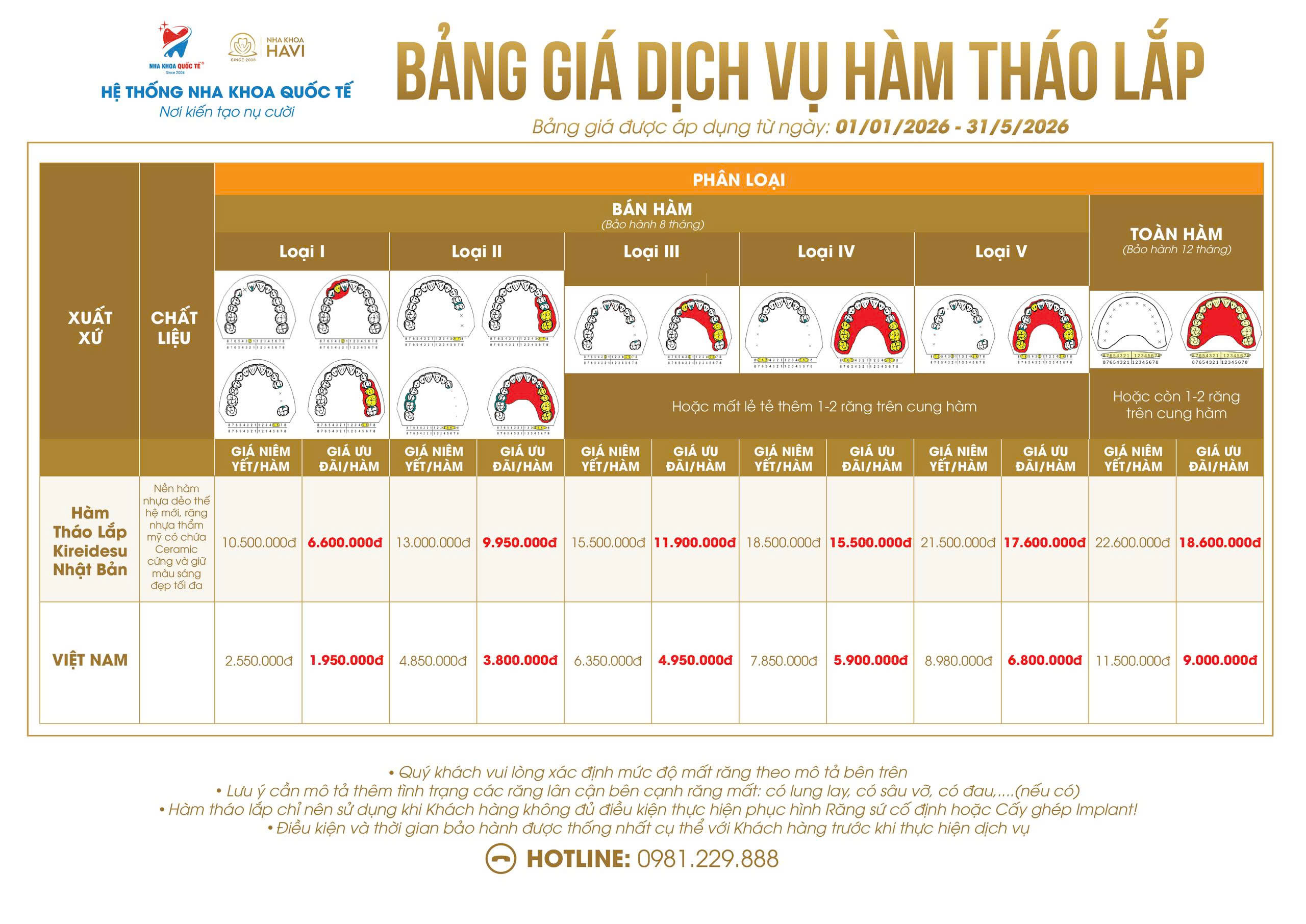 BẢNG GIÁ DỊCH VỤ HÀM GIẢ THÁO LẮP